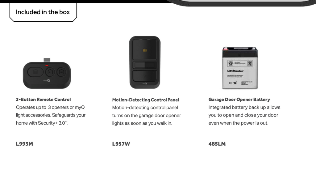- (1) Three-Button Transmitter (L993M) - Operates up to 3 openers or myQ light accessories. Safeguards your home with Security+ 3.0™.