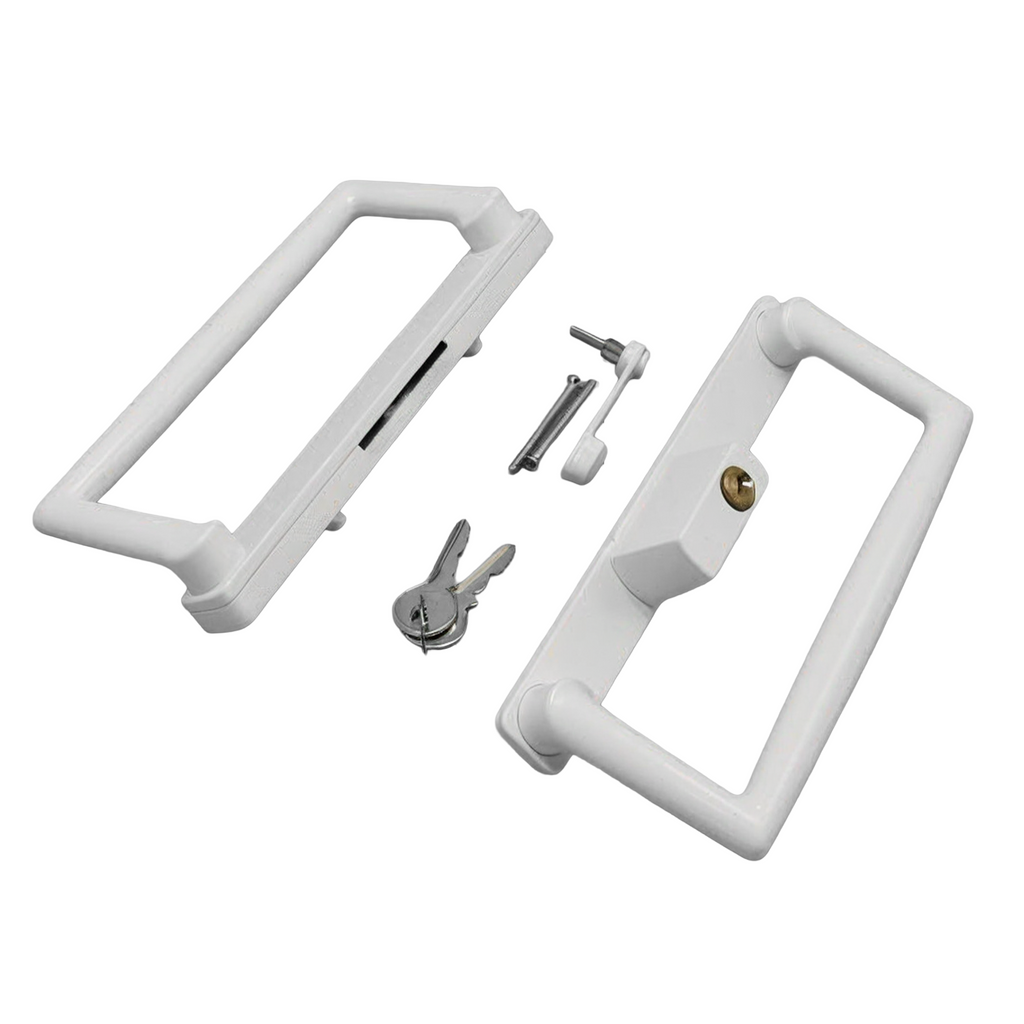 PGT/ CGI Sliding door handle set with 4-15/16" hole centers. Color White. Overall Length: 8.717". Thumb lever is a square drive. Includes interior and exterior handles, thumbturn, two handle screws, keeper and spacers. SM5700-WH.