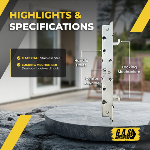 Dual Hook mortise lock for sliding doors with center latch. Patent No. US 7,040,671 B2. Stainless Steel lock. Manufactured by Amesbury. Used with center latch sliding door handles.