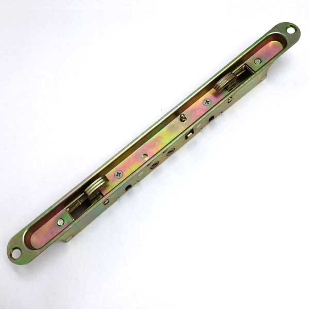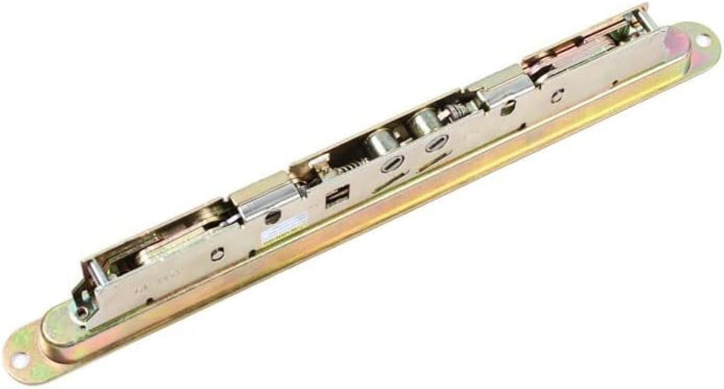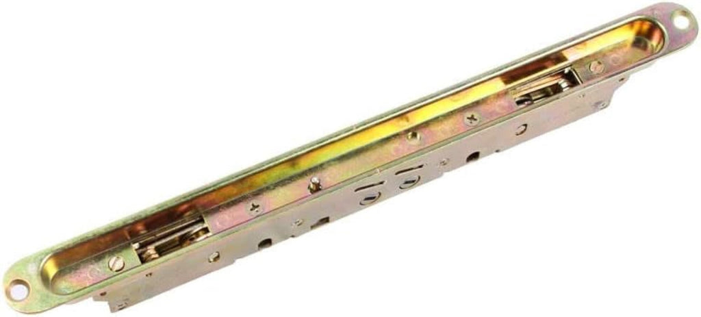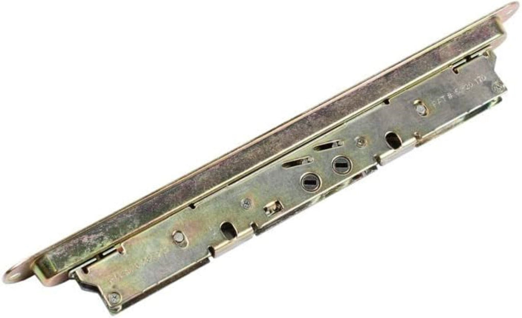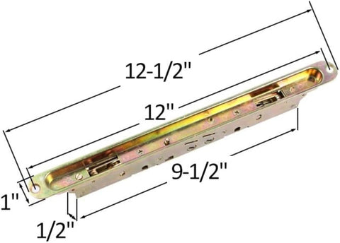 Replacement 2-point mortise lock with pocket trim-plate. Installation holes measure 12" on hole centers. Used in wood and vinyl sliding patio glass doors. Includes installation fasteners. Features an anti-slam button, a mishandling device, assures that the door is shut before the lock can be actuated. This feature prevents potential damage to the locking bolts by not allowing the bolts to be extended unless the door is closed against the frame. This is a genuine AmesburyTruth sliding glass door lock.